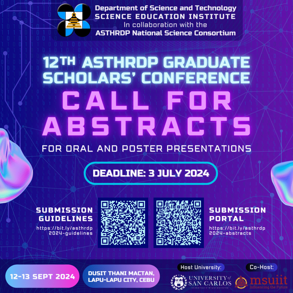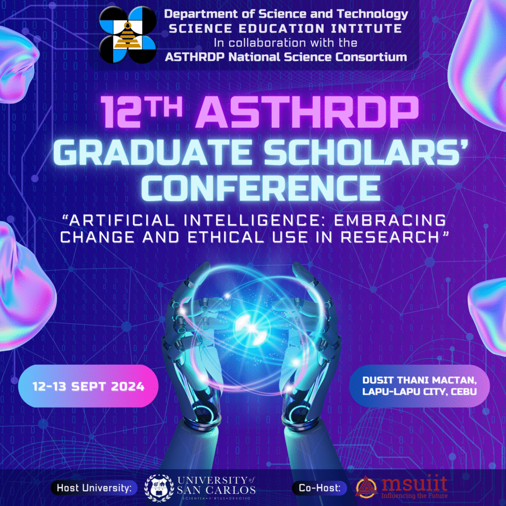 The Department of Science and Technology – Science Education Institute (DOST-SEI), in collaboration with the University of San Carlos, successfully hosted the 12th Graduate Scholars’ Conference of the Accelerated Science and Technology Human Resources Development Program (ASTHRDP) on September 12–13, 2024 at the Dusit Thani Mactan Resort in Lapu-Lapu City, Cebu.